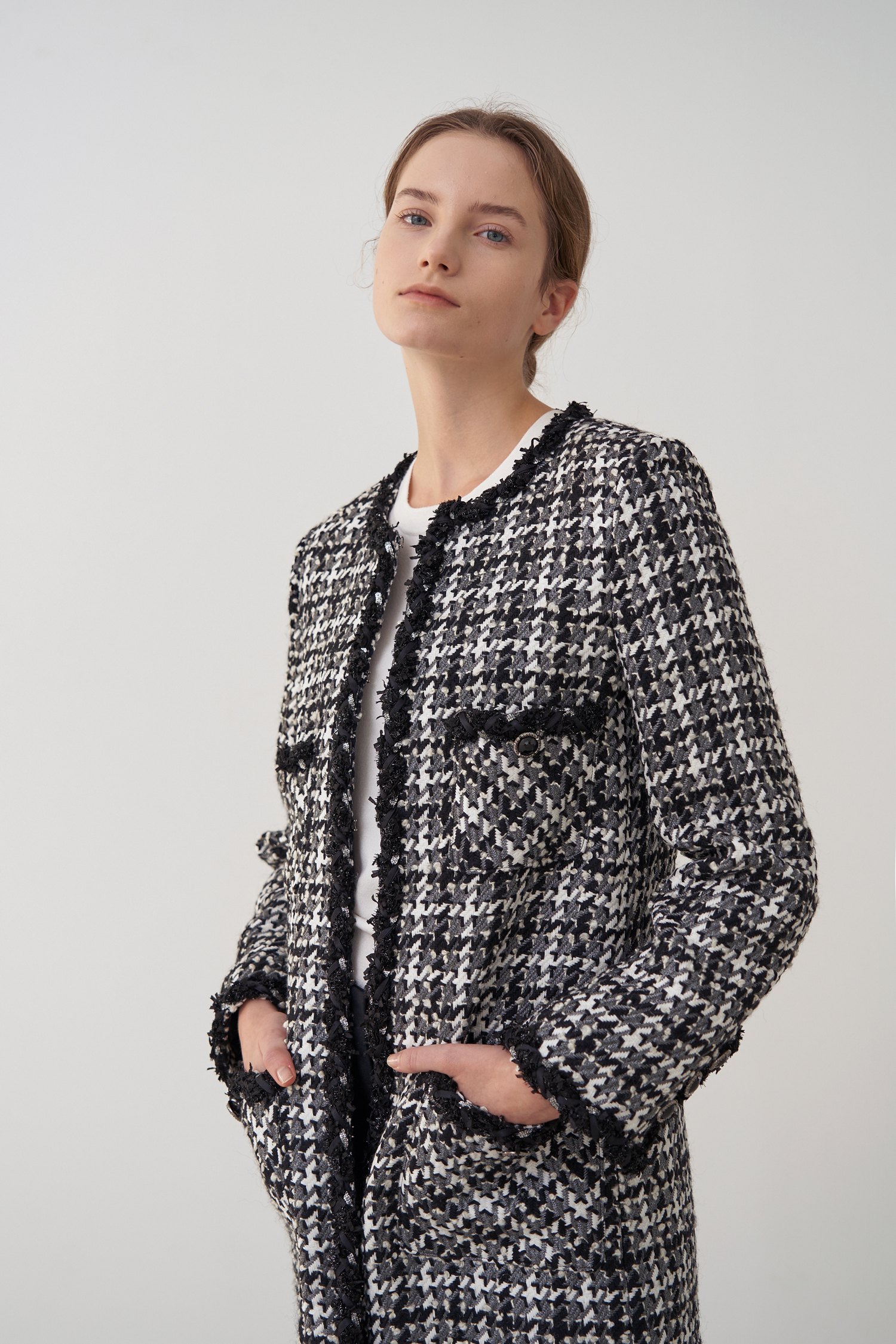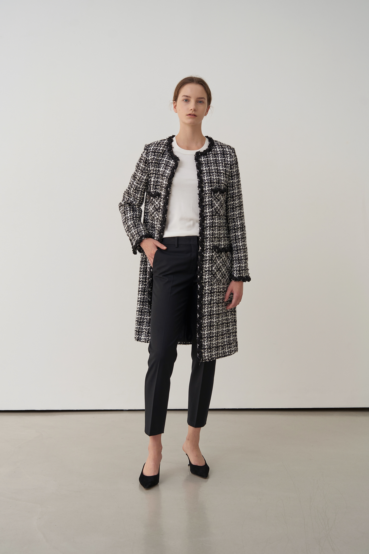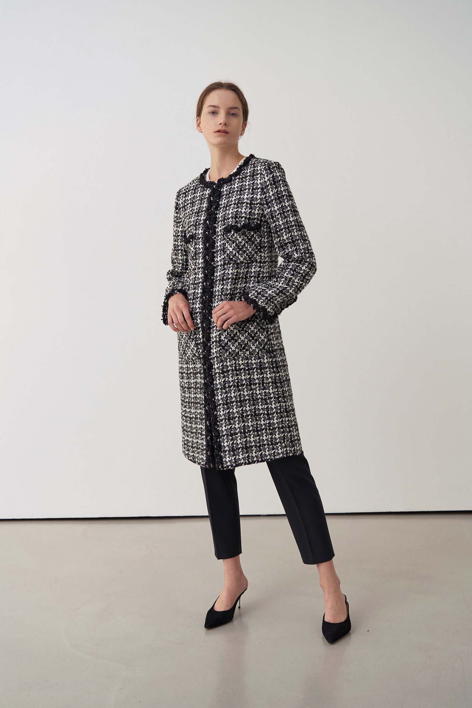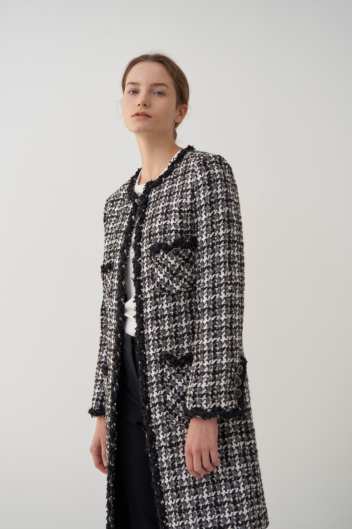 영국 'LINTON'사의 수입 원단으로 울 부클레 텍스처 트위드 소재의 하운즈투스 체크패턴이 세련된 무드가 돋보입니다.
