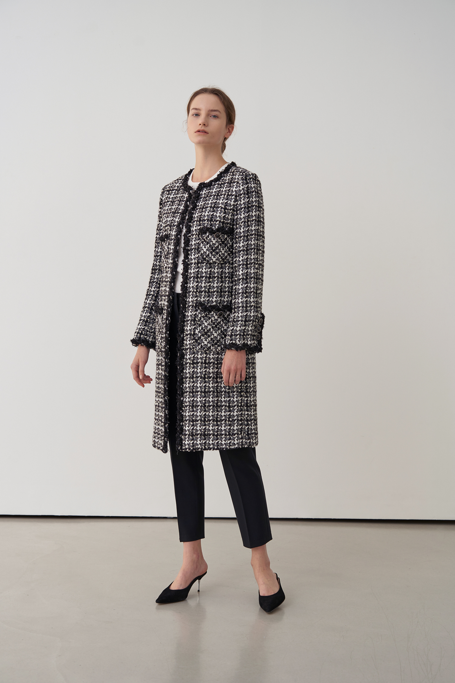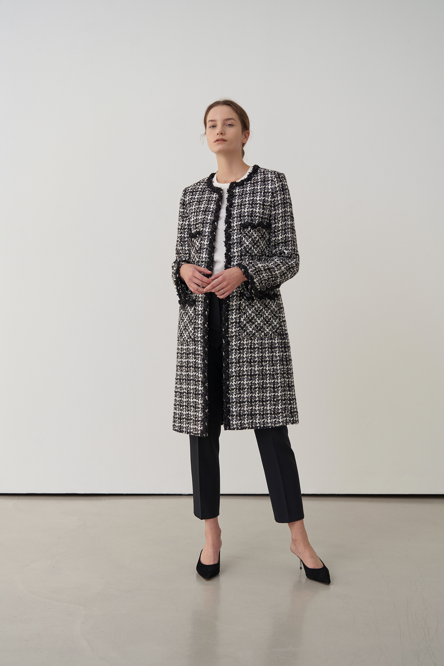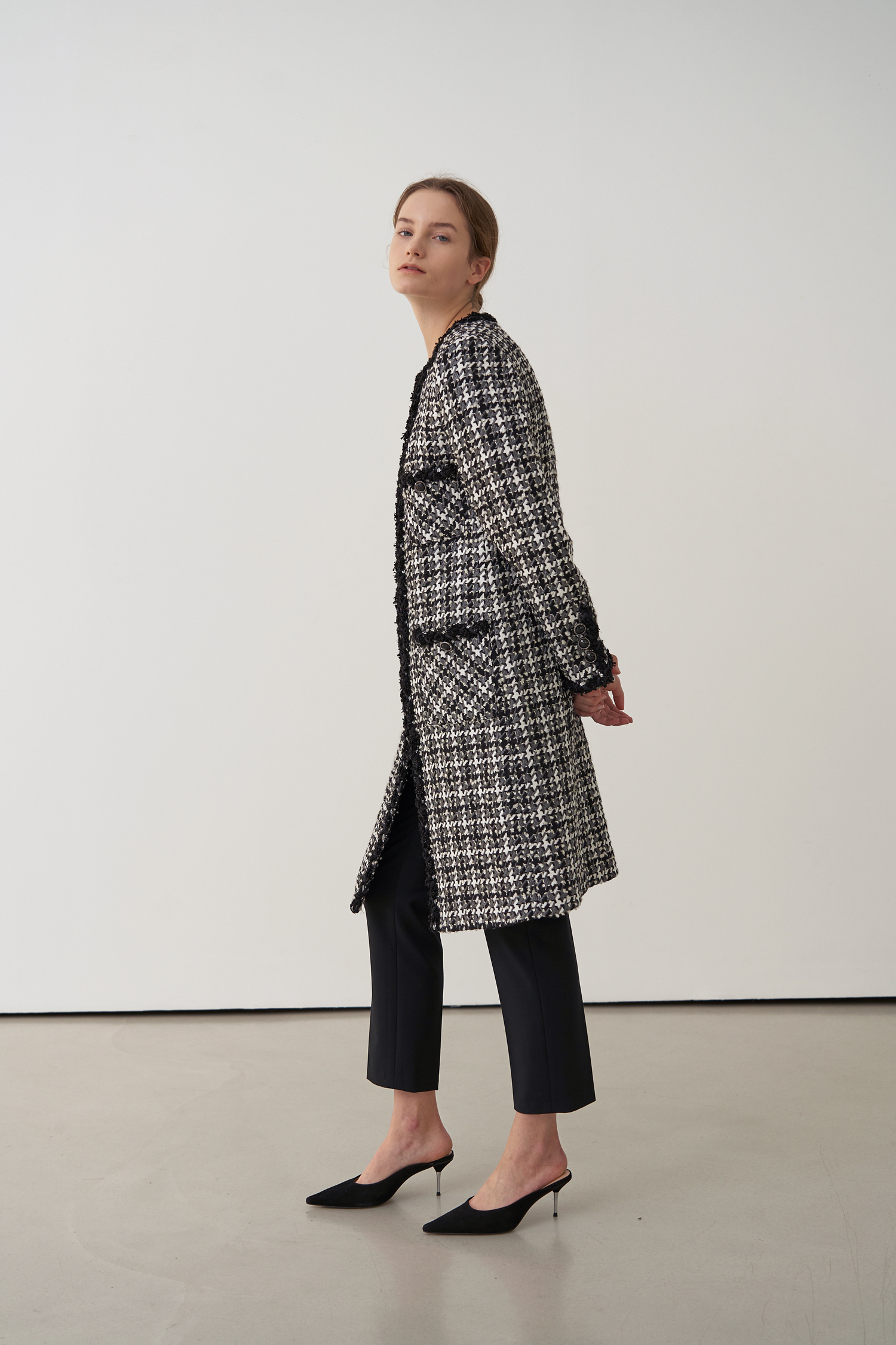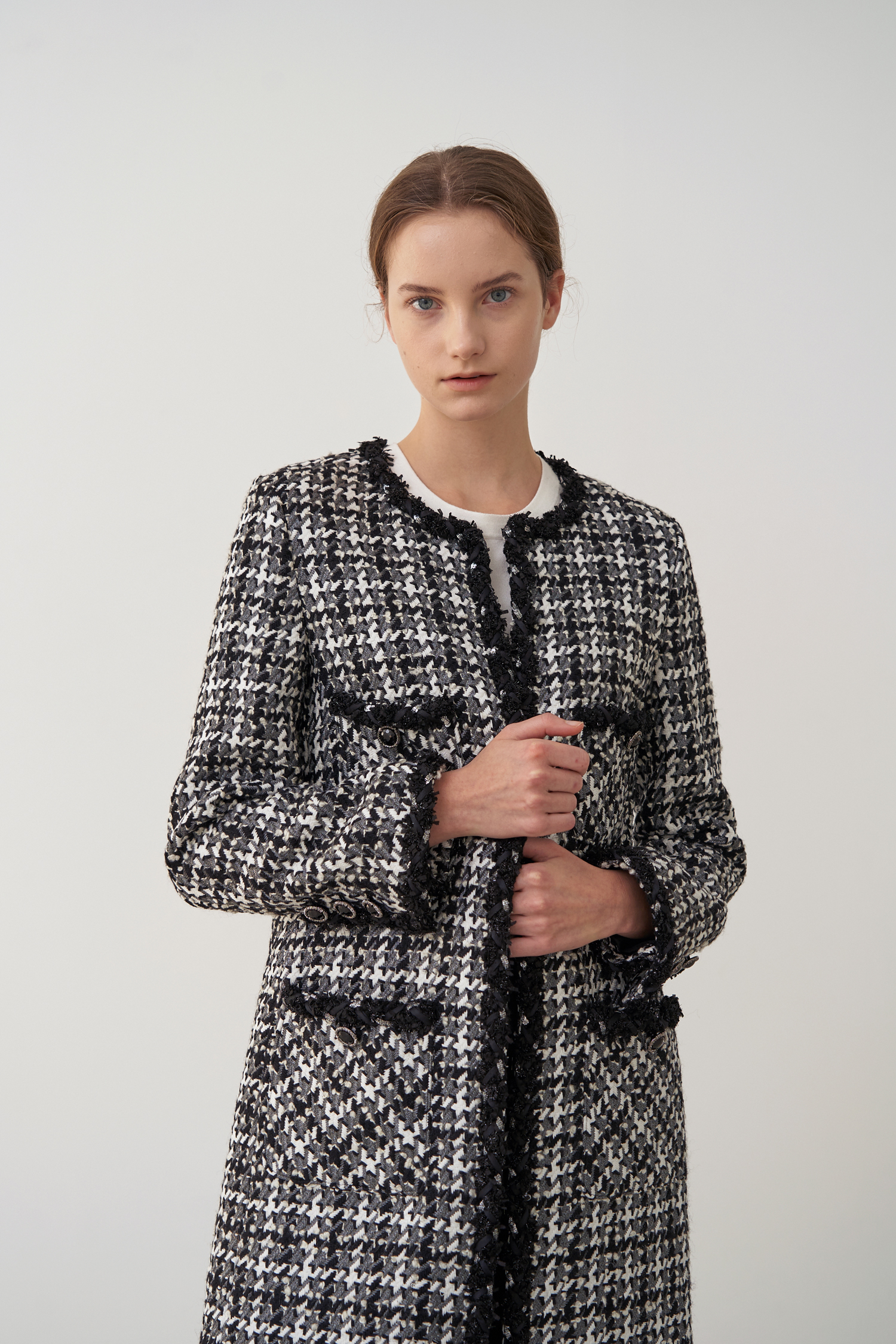 영국 'LINTON'사의 수입 원단으로 울 부클레 텍스처 트위드 소재의 하운즈투스 체크패턴이 세련된 무드가 돋보입니다.