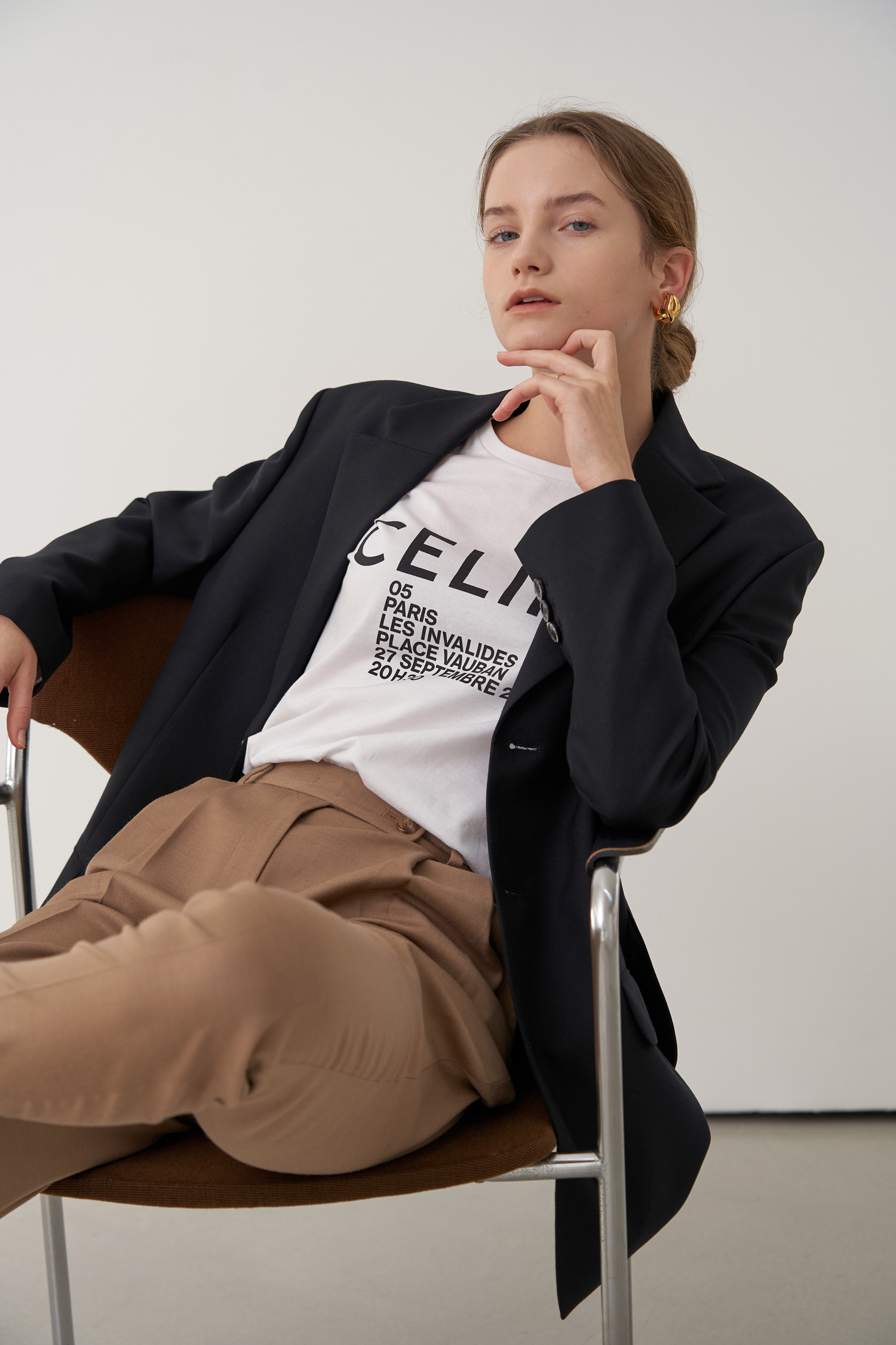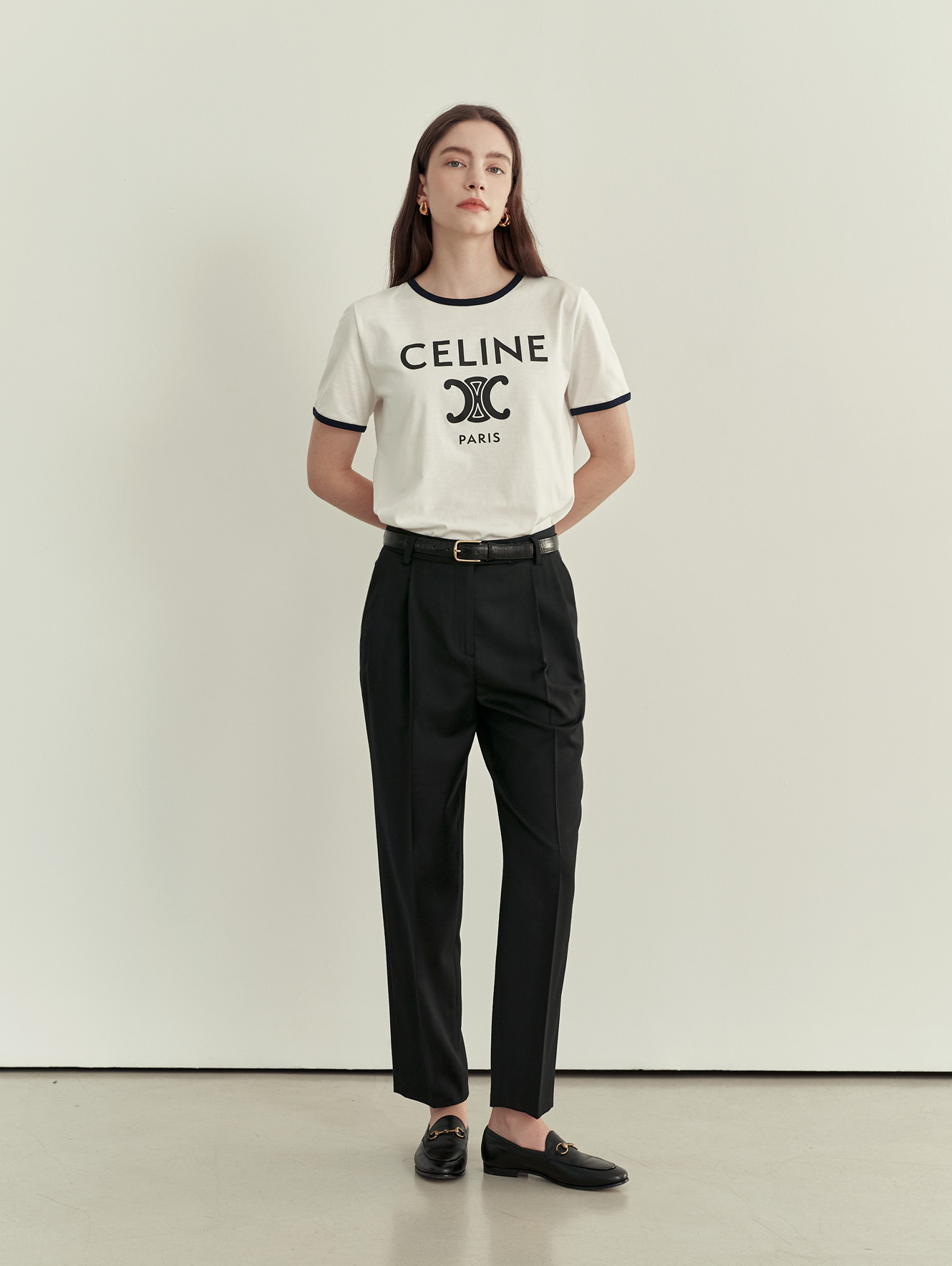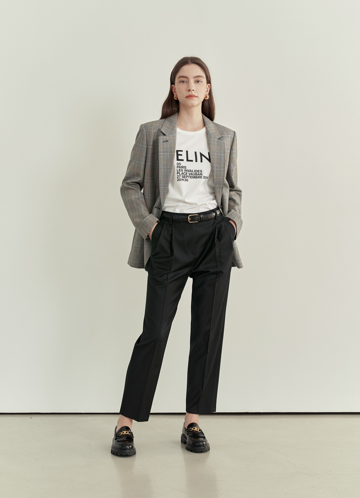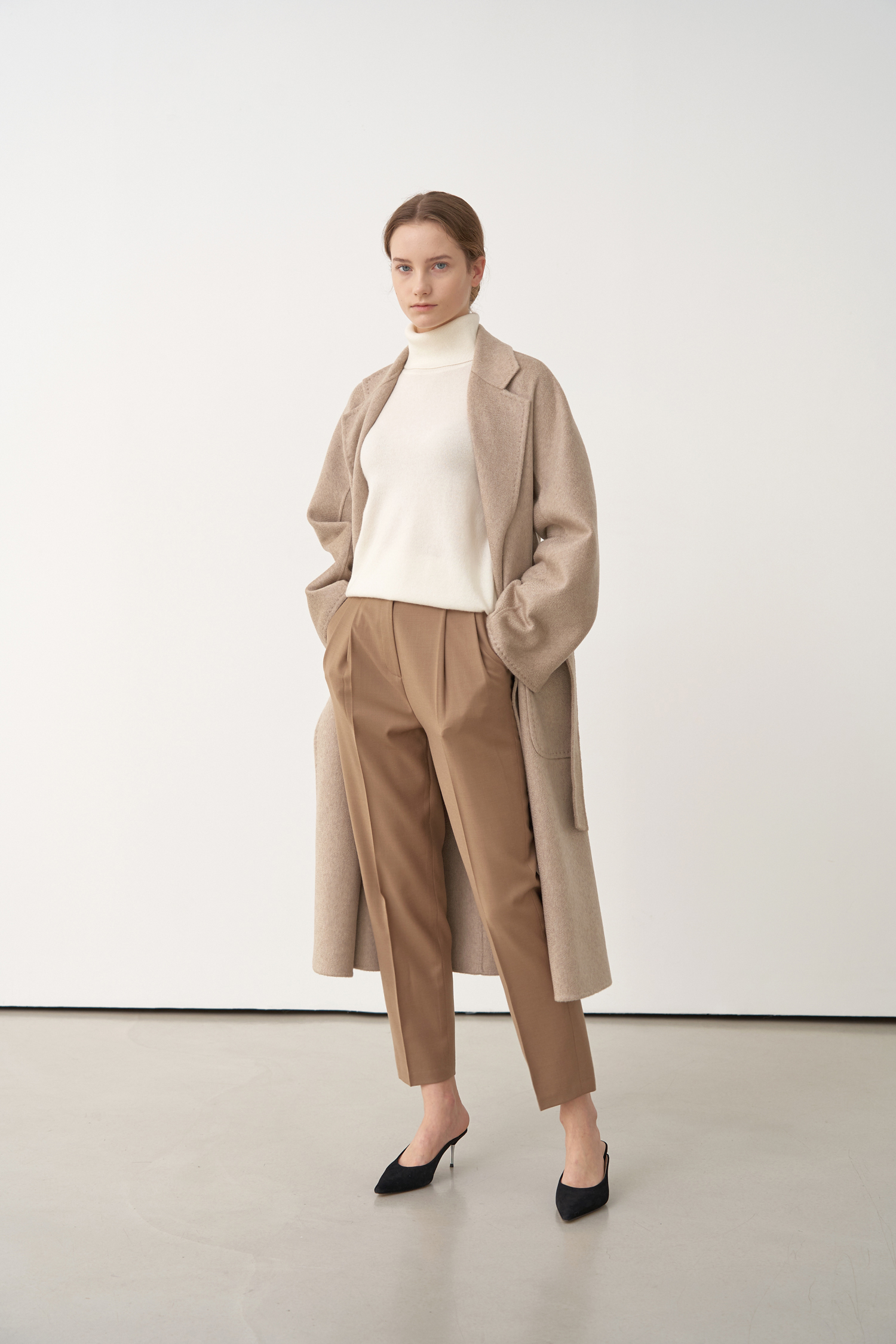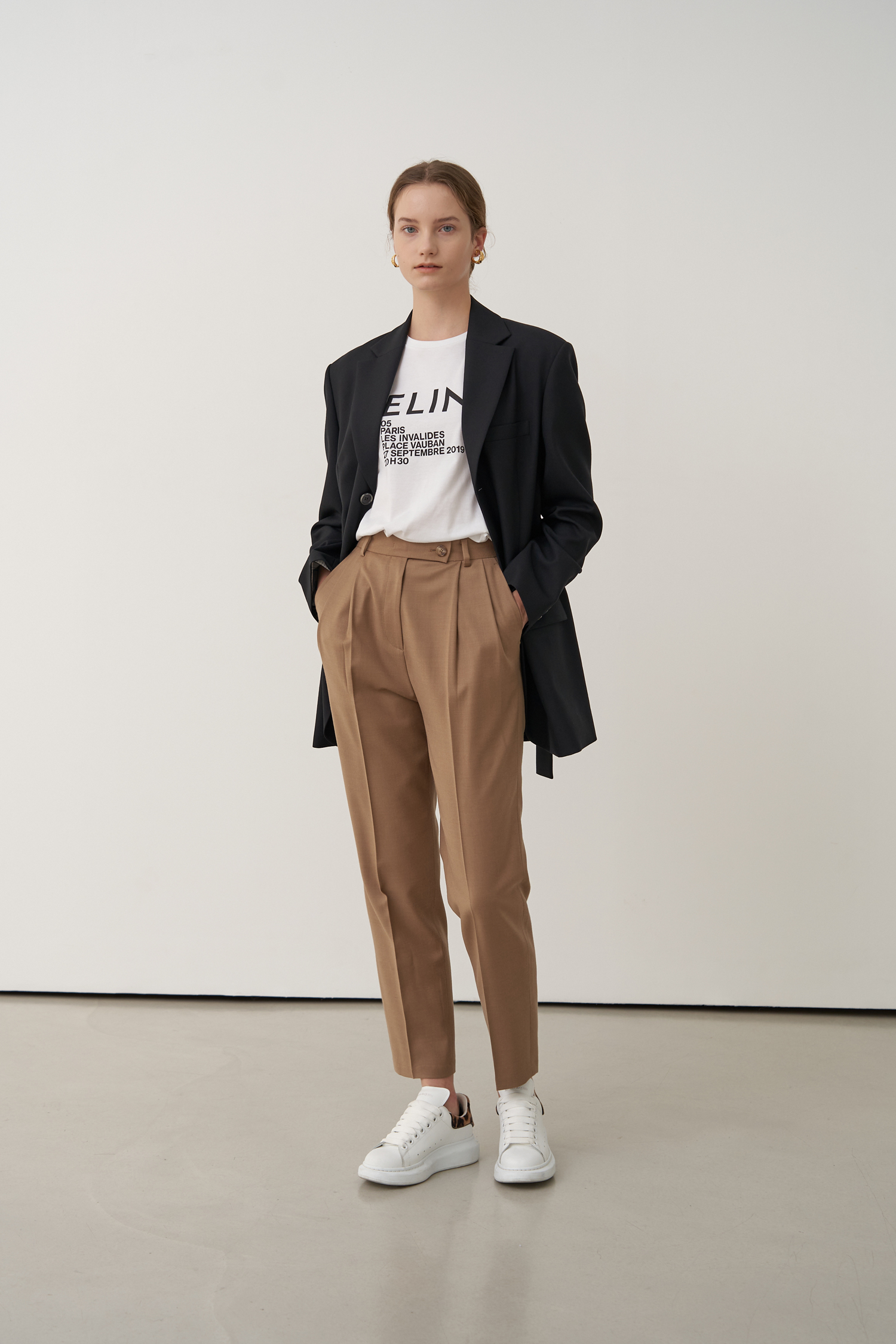 - 프론트 허리 라인 아래로 투턱을 잡아 라인이 깔끔하게 떨어지는 여유있는 실루엣으로 모던하고 시크한 무드를 자아내는 디자인